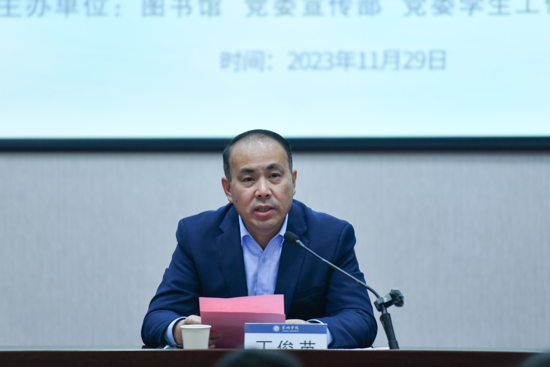 丁俊苗致开幕辞。他结合自身学习经历,围绕“为什么读书”“怎么读书”“如何读出成效”三个问题向与会师生分享读书心得,他指出读书贵在修德,要认真阅读经典,在阅读中坚定共产主义的理想信念;读书贵在思考,不可浅尝辄止,不仅要深度阅读,还要思考追问,养成善于思考的良好习惯;读书贵在写作,不仅要多读书,读好书,取其精华,还要认真对书中内容咀嚼消化。他希望大学生们要珍惜学习时光和机会,重视阅读,喜爱阅读,把读书作为一种生活方式,读出知识、读出思想、读出力量。在致辞中丁俊苗还特别推荐了图书馆新购图书《复兴文库》,希望广大师生从中深切体悟中华民族走向伟大复兴的历史逻辑、思想源流和文化脉络,做到对传承历史文脉有恒心,对弘扬红色精神有初心,对树立文化自信有决心,从而锤炼政治品格,筑牢信仰之基,坚定文化自信,立志成才报国。