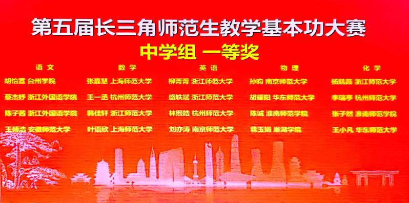 2023年12月19日,由上海市教育委员会、浙江省教育厅、江苏省教育厅、安徽省教育厅联合主办的第五届长三角师范生教学基本功大赛在安徽师范大学落下帷幕。学校选派的两名学子蒋玉娟、吴博雅在47所院校309名参赛选手线下同台竞技的决赛中脱颖而出,分别荣获物理组一等奖、综合组二等奖的好成绩。