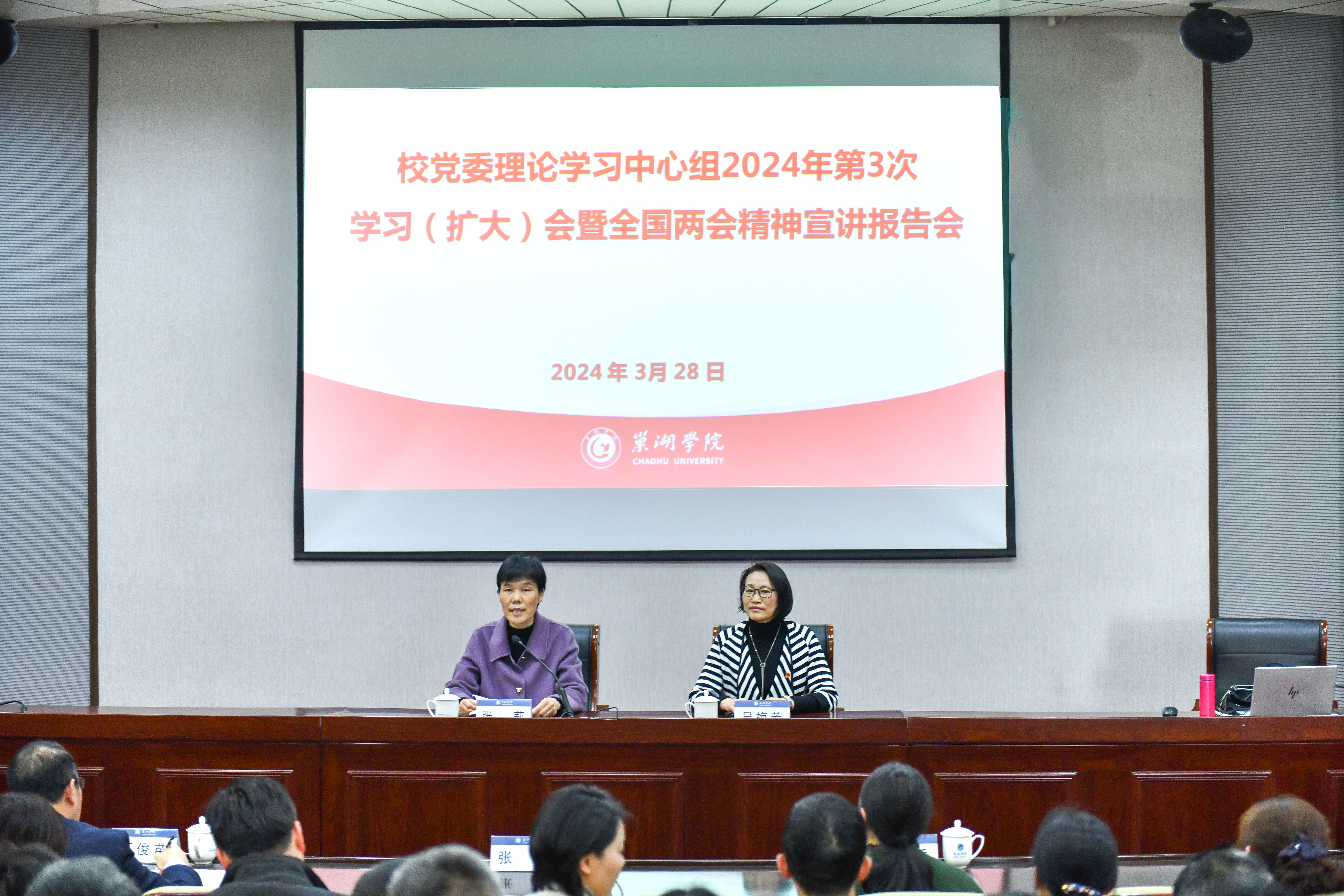 校党委副书记、校长张莉主持会议。十四届全国人大代表、中共安徽省第十一次党代会代表、中共安徽省委党校(安徽行政学院)党建部主任吴梅芳教授作全国两会精神宣讲专题报告。校党委理论学习中心组成员、处级领导干部、基层民主党派代表和学生代表200余人聆听了专题宣讲报告。