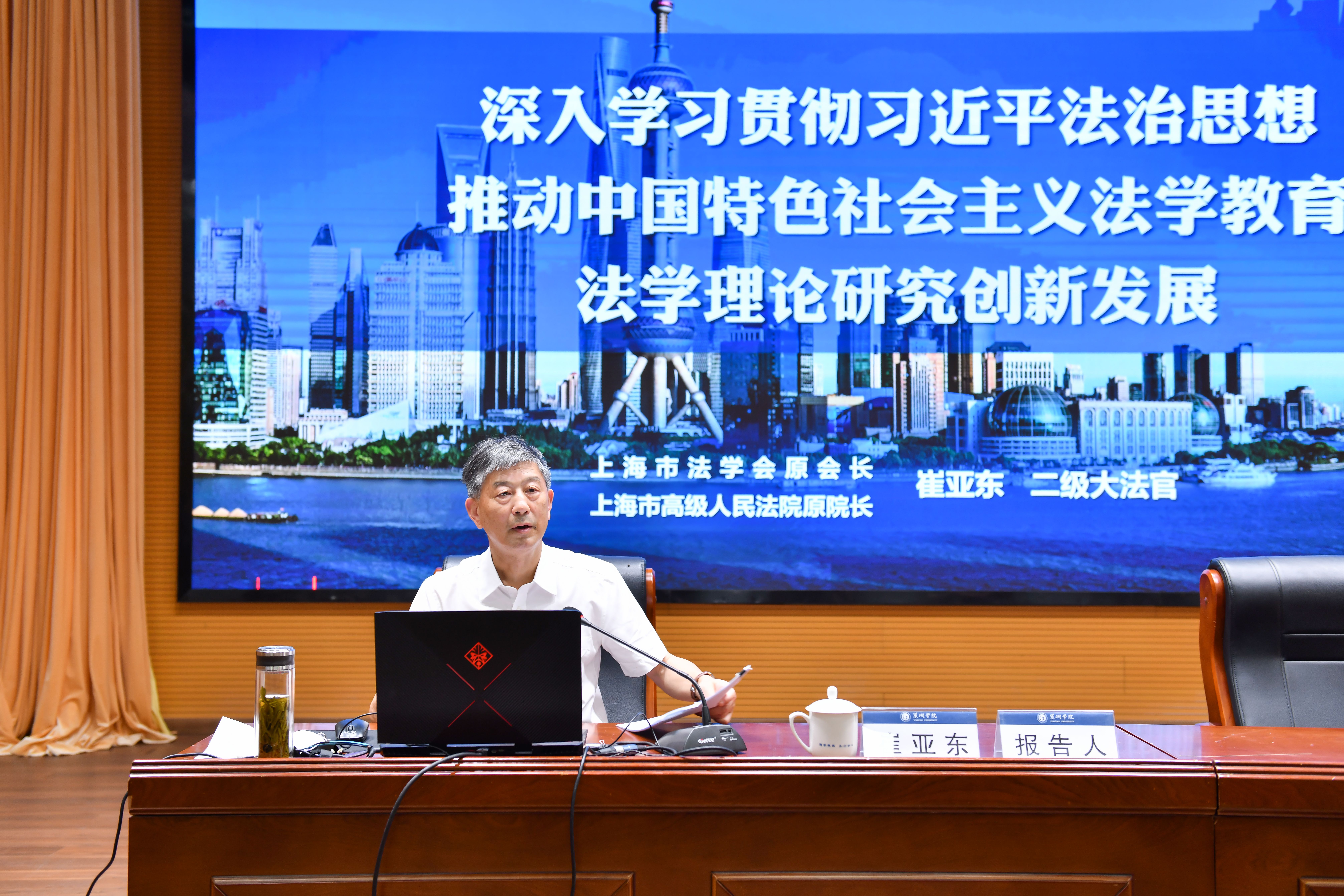 校党委副书记、校长张莉主持会议。上海市高级人民法院原党组书记、院长,二级大法官,上海市法学会原党组书记、会长崔亚东作题为《深入学习贯彻习近平法治思想推动中国特色社会主义法学教育法学理论研究创新发展》的专题报告。