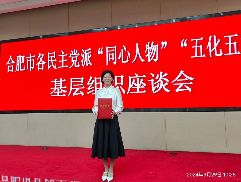会上,市委统战部负责人宣读了《关于对合肥市统一战线庆祝中华人民共和国成立75周年“同心人物”、“五化五好”基层组织予以表扬的通报》。此次评选活动由市委统战部指导,市各民主党派联合举办。经过严格评审和公示程序,最终评选出合肥市统一战线庆祝中华人民共和国成立75周年“同心人物”75人、合肥市各民主党派“五化五好”基层组织15家。教师教育学院陈茜老师从全市6000多名民主党派成员中脱颖而出,获评合肥市统一战线庆祝中华人民共和国成立75周年“同心人物”光荣称号。