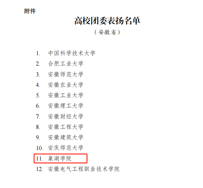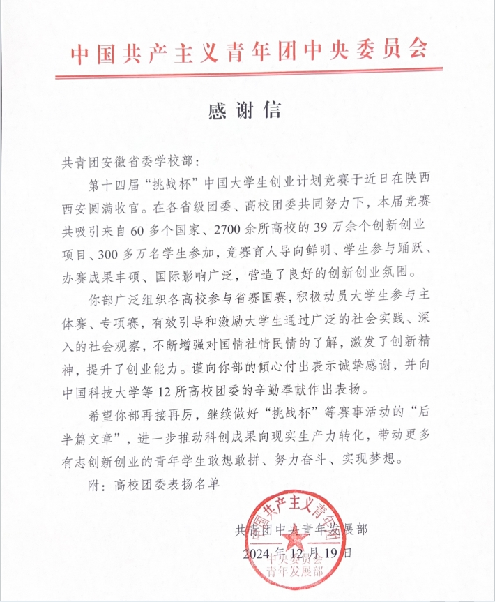 近日,团中央对在第十四届“挑战杯”中国大学生创业计划竞赛组织发动工作中表现突出的省级团委和高校团委致信表扬。共有2700余所高校组织参加“挑战杯”竞赛,其中安徽省12所高校团委被表彰,awc777万象城娱乐官网团委位列其中,这是对我校组织参与“挑战杯”中国大学生创业计划竞赛相关工作的充分肯定。