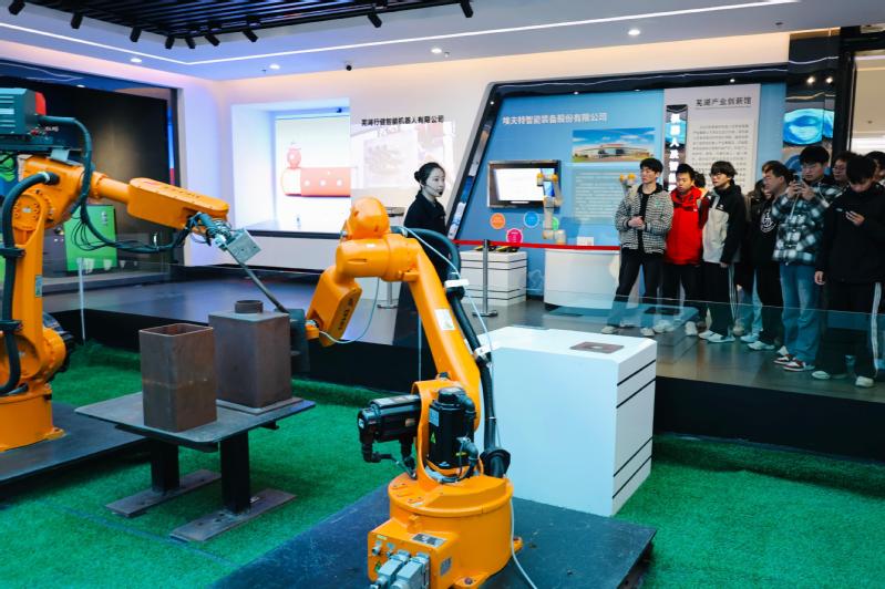 师生一行首站抵达芜湖市大学生实习实践基地,深入了解基地在就业服务、职业咨询、技能培训及企业资源对接等方面的配套支持。通过实地参观和现场讲解,毕业生们对芜湖市人才政策和基地配套服务有了直观认识。在芜湖产业创新馆,在讲解人员带领下,毕业生沉浸式观摩当地支柱产业发展情况,以及新能源、人工智能等战略性新兴产业的创新成果。不少同学表示,芜湖蓬勃的产业生态和创新氛围为职业发展提供了广阔空间。