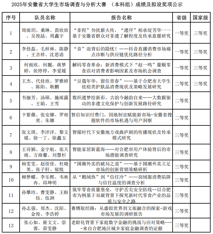 近日,由安徽省教育厅主办、安徽财经大学承办的2025年安徽省大学生市场调查分析大赛暨全国大学生市场调查与分析大赛安徽赛区(本科组)圆满结束。本次大赛安徽赛区共计42所高校11368名本科生组队参与了省赛。