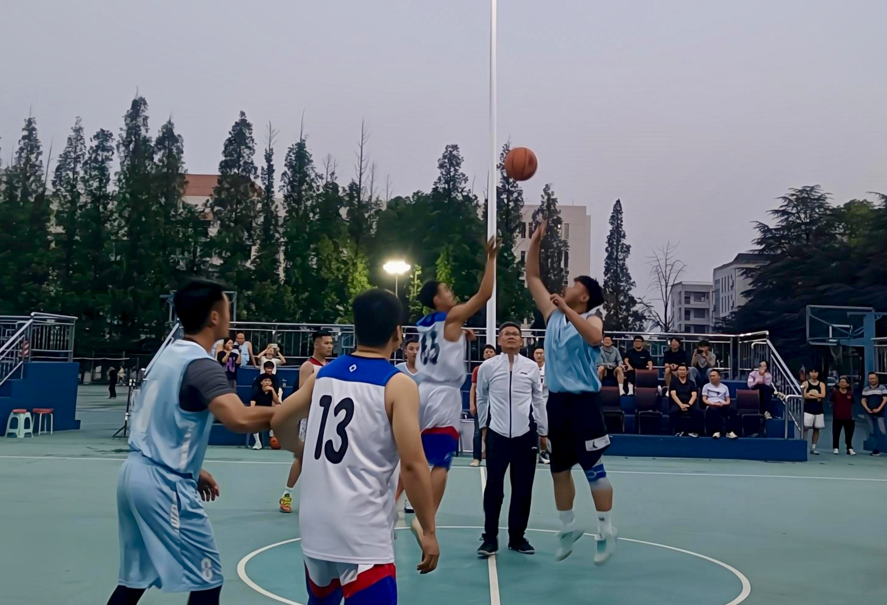 5月28日晚7点,赛事迎来高潮环节——教职工联队与体育学院队的表演赛在灯光球场精彩上演。校党委书记周峰、校长张莉、党委副书记宋立敏等校领导出席,为参赛队员加油助威。周峰为比赛开球,将现场气氛瞬间点燃。