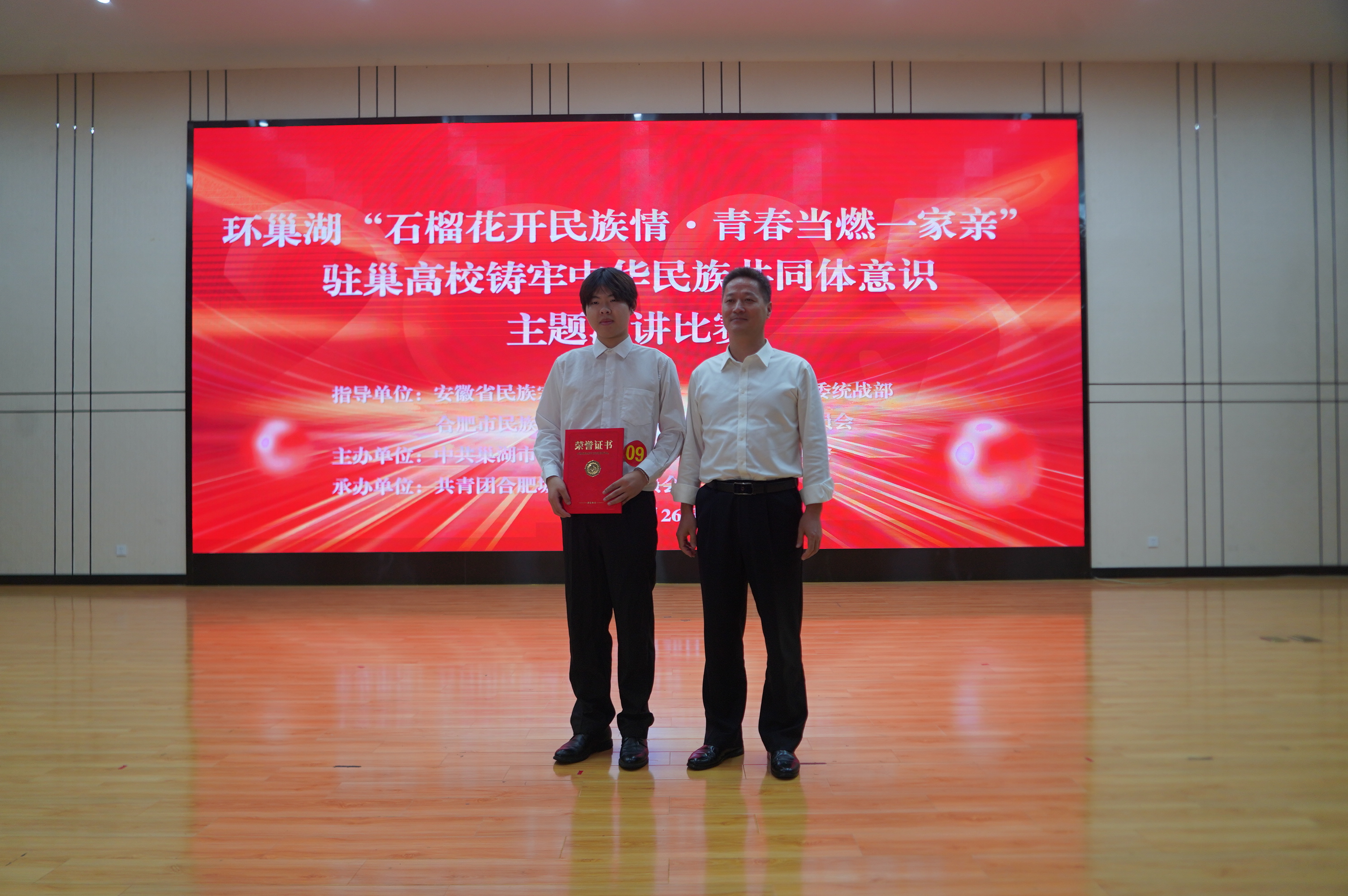 决赛现场,我校黄佳佳同学以《同谱华夏交响乐共筑团结新篇章》为题,结合自己所学专业,把国家的发展比作一部恢弘的交响乐,56个民族是其中不可或缺的声部,每个人都是新时代“交响乐”的演奏者。他认为,铸牢中华民族共同体意识,不是遥远的口号,而是每个人演奏好每一个音符的责任——既要守护好自己民族的独特音色,也要学会与其他“声部”和谐共鸣。肖炳祥同学则以一部历史电影《红河谷》为切入点,结合巢湖以展演融多俗、景区传认同、社区创示范,绘就民族团结盛景的鲜活事例,阐述了民族团结不仅是中华民族千百年来的精神财富,更是国家繁荣昌盛的稳固基石,各民族要像石榴籽一样紧紧相依。经过激烈角逐,最终,我校黄佳佳、肖炳祥2位同学分别荣获特等奖(全场唯一)、二等奖的好成绩,充分展现了我校学子优良的综合素养和昂扬的精神风貌,更体现了新时代青年深厚的家国情怀,赢得了评委与观众的广泛共鸣和认可。