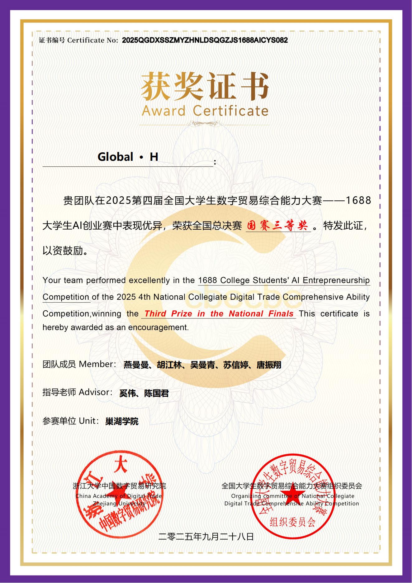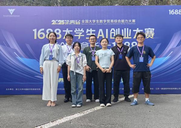 9月26日下午,参赛团队在指导教师的带领下,展开了紧张有序的全过程排练,从路演展示到临场答辩,不放过任何一个细节。27日上午,来自全国各地的100余支队伍陆续走进答辩现场,第四届全国大学生数字贸易综合能力大赛——1688大学生AI创业赛正式拉开帷幕。面对由5名评委组成的评审团,GlobalHorizon按照多日来的演练,有条不紊地完成了项目汇报。汇报结束后,评委们首先对团队成果给予肯定,随后围绕“货物投放平台、货物供应保障、客户问题及时响应”等关键环节进行提问,团队成员均给予准确且专业的答复。经过不懈努力,不畏强手,一路过关斩将,GlobalHorizon团队最终获得国赛三等奖的好成绩。