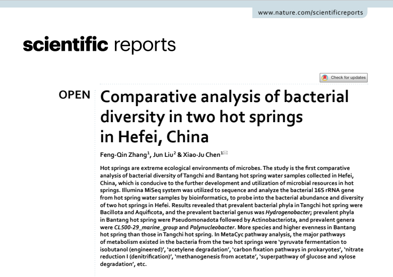 中心研究人员张凤琴长期从事微生物发酵的研究。在温泉嗜热菌的研究中取得新进展,相关成果以“Comparative analysis of bacterial diversity in two hot springs in Hefei, China”为题发表在国际权威期刊《Scientific Reports》(中科院三区,IF:4.99)。
