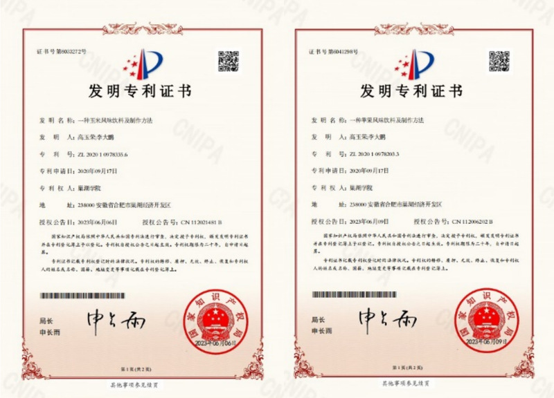 2023年,中心研究人员高玉荣教授的两项研究成果获国家发明专利授权,分别是《一种玉米风味饮料及制作方法》(专利号ZL 2020109783356)和《一种苹果风味饮料及制作方法》(专利号ZL 2020109782033)。