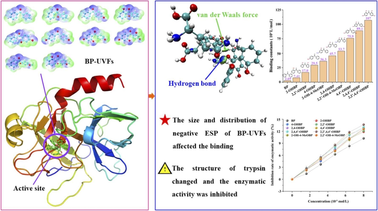 二苯甲酮类紫外吸收剂(BP-UVFs)在个人护理品、塑料制品和纺织品中的大量应用导致了严重的环境污染问题。环境中的BP-UVFs具有持久性和生物积累性,可以通过食物链和饮用水暴露于人体,对人体健康具有潜在威胁。本研究以10种典型BP-UVFs和胰蛋白酶为对象,在模拟人体生理条件的基础上,通过多种光谱学研究手段发现,不同BP-UVFs与胰蛋白酶活性位点结合强度差异显著(2.69 × 104-1.07× 106 L/mol),能够对胰蛋白酶结构产生损伤、抑制酶活性(10.2% - 12.6%)。进一步量子化学计算表明,由于构成胰蛋白酶的大多数氨基酸分子表面静电势分布不均匀且正静电势面积大于负静电势面积,因此具有较大负静电势面积且分布相对不均匀的BP-UVFs更易与临近的多个氨基酸分子发生弱相互作用,导致分子间结合强度和酶活抑制率差异。本研究为BP-UVFs环境健康风险提供了基础数据支撑,也为污染物与蛋白质结合机制提供了新的见解。