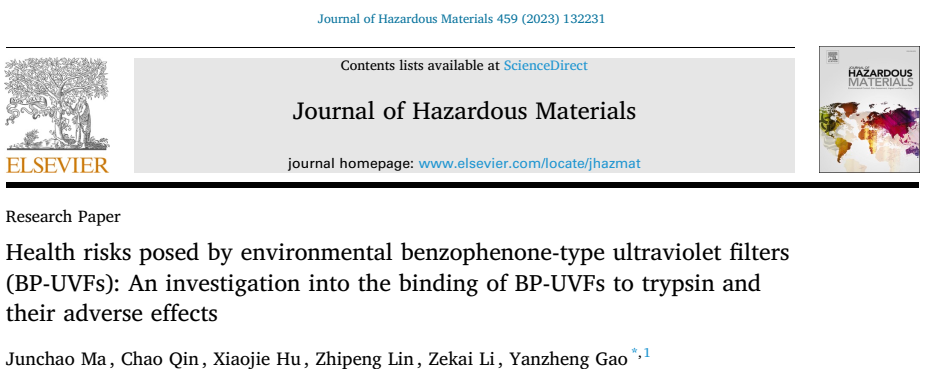 近日,中心研究人员马俊超博士在污染物与生物大分子结合效应与机制研究中取得新进展,相关成果以“Health risks posed by environmental benzophenone-type ultraviolet filters (BP-UVFs): An investigation into the binding of BP-UVFs to trypsin and their adverse effects”为题发表在国际权威期刊《Journal of Hazardous Materials》(中科院一区/Top期刊,IF:13.6)。