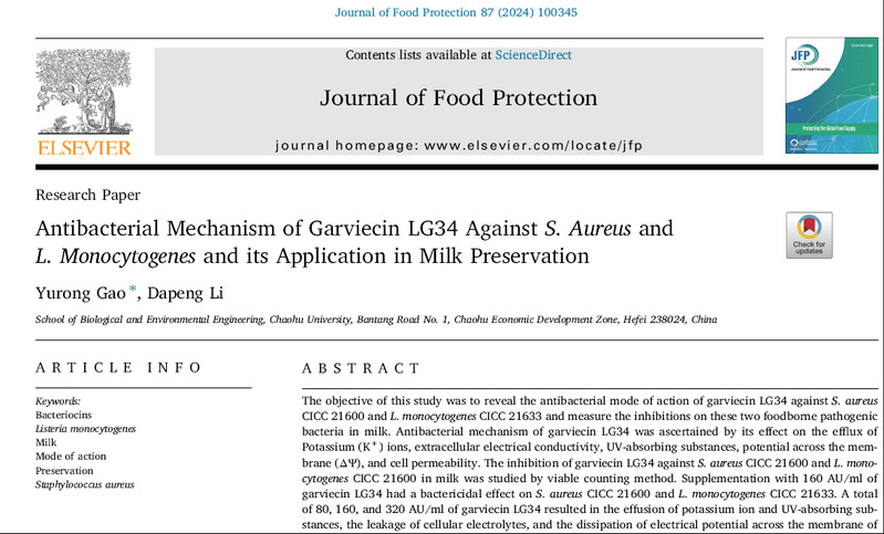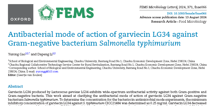 2024年,中心研究人员高玉荣在生物防腐剂研究中取得新进展,相关成果以“Antibacterial mode of action of garviecin LG34 against Gram-negative bacterium Salmonella typhimurium” 和“Antibacterial mechanism of garviecin LG34 against S. Aureus and L. monocytogenes and its application in milk preservation”为题分别发表在《FEMS Microbiology Letters》和《Journal of Food Protection》期刊上。
