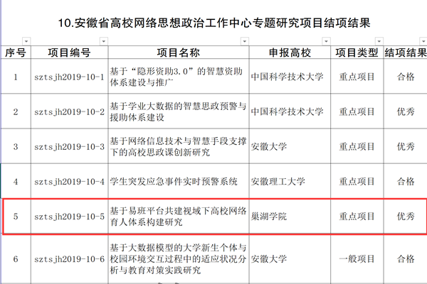 近日,省教育厅公布2019年高校思想政治工作能力提升计划结项结果,我校党委副书记阮爱民主持的省级网络思政重点研究项目《基于易班平台共建视域下高校网络育人体系构建研究》(编号sztsjh2019-10-5)顺利结题并获评“优秀”等次。