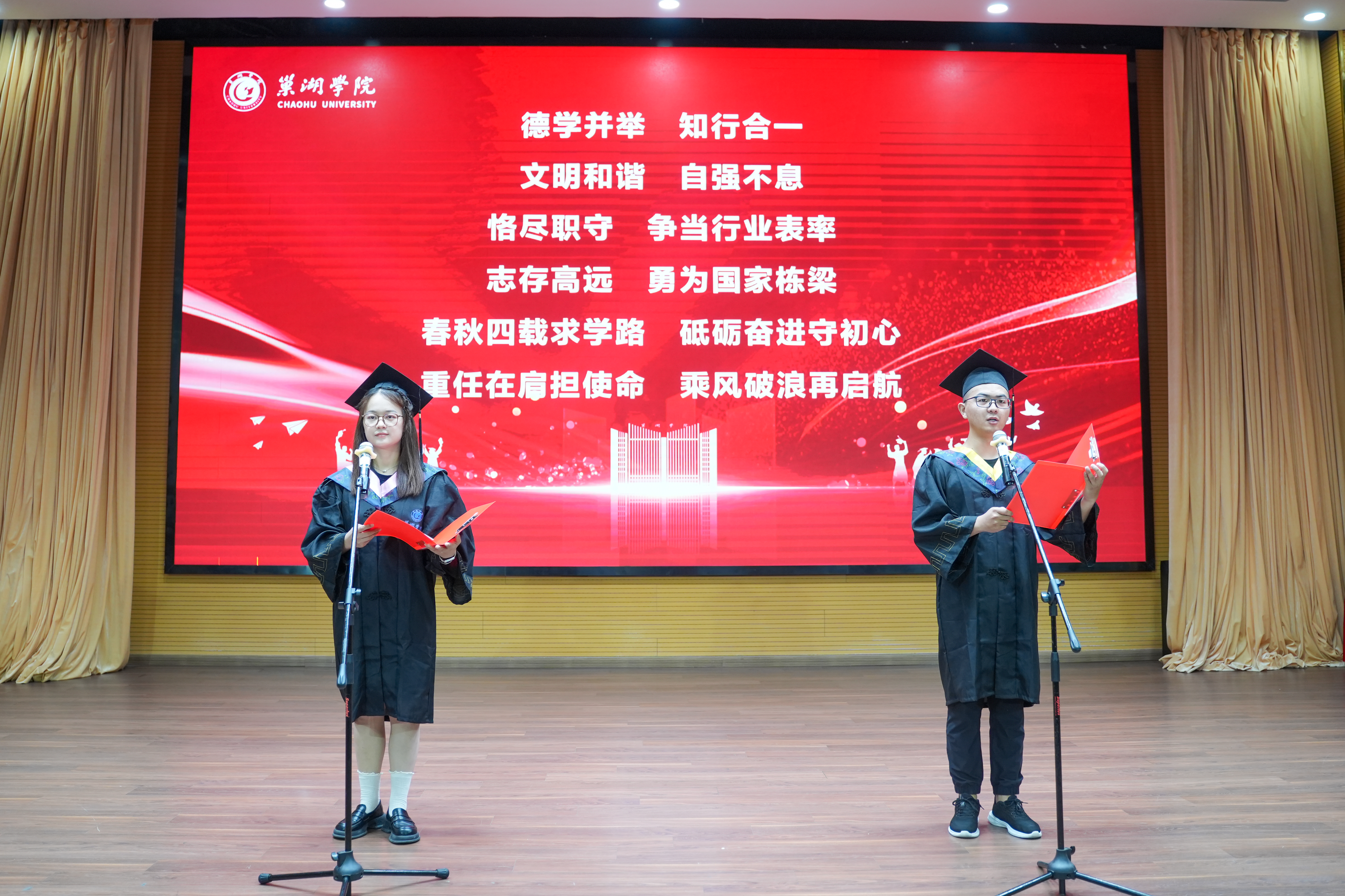 毕业生代表朱文萱、王晔宇带领全体毕业生庄严宣誓,郑重承诺要胸怀祖国,心系母校,铭记校训精神,乘风破浪再启航!