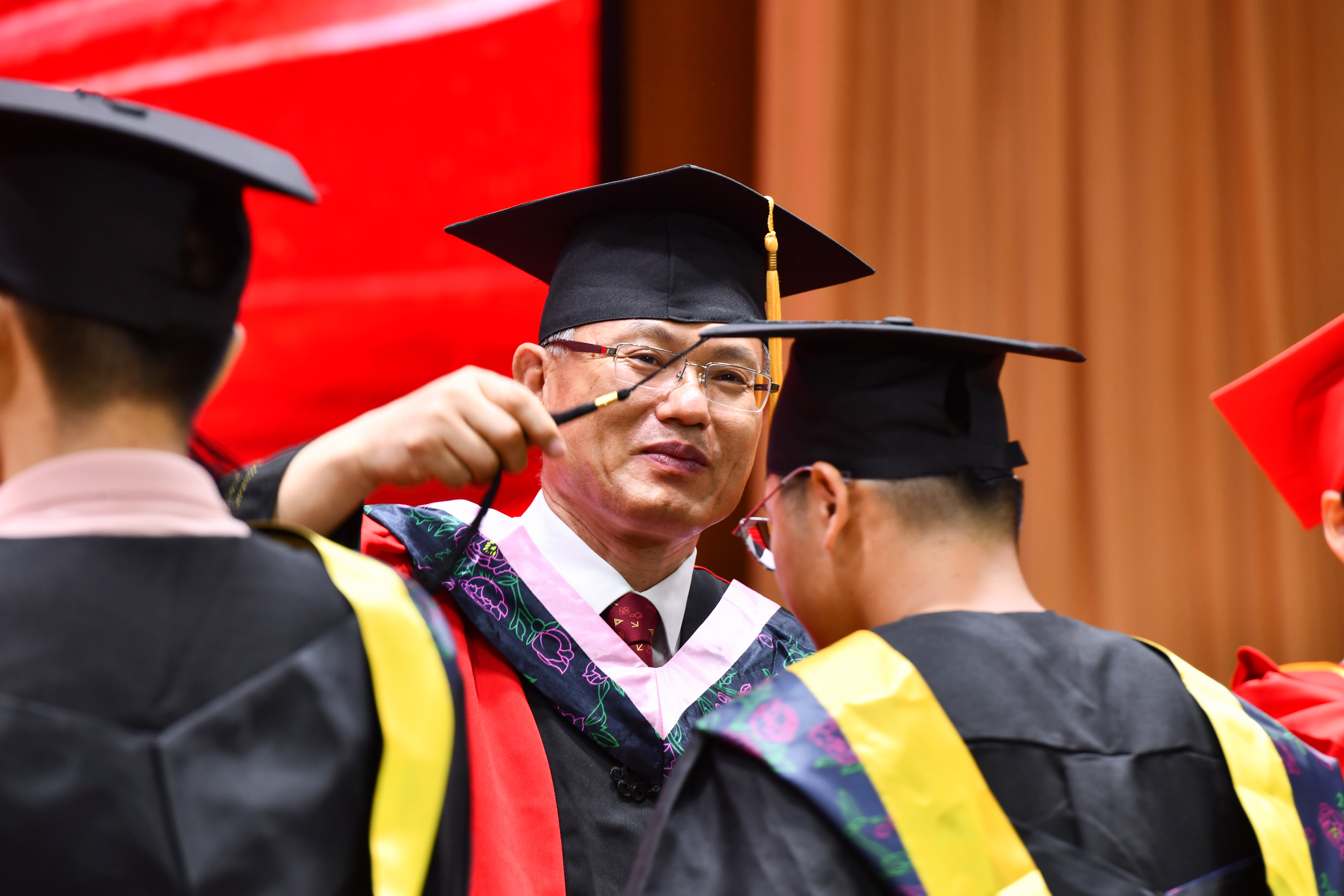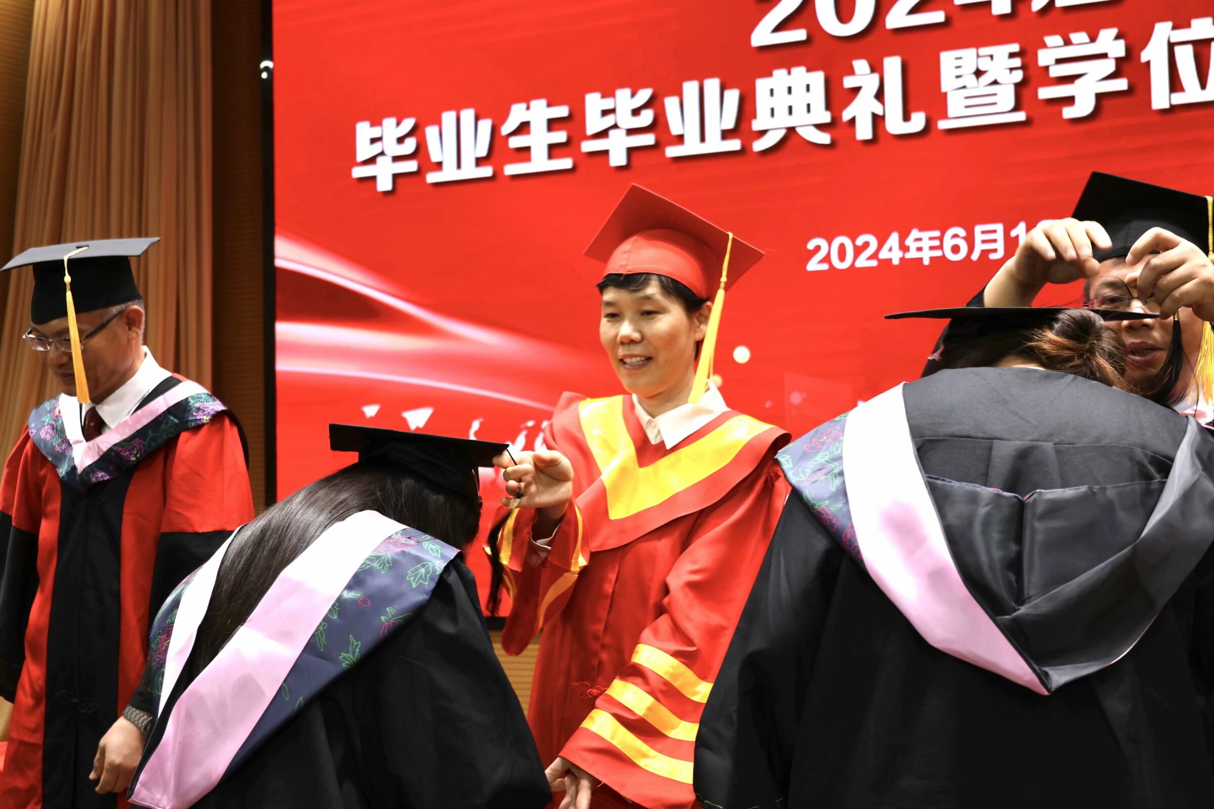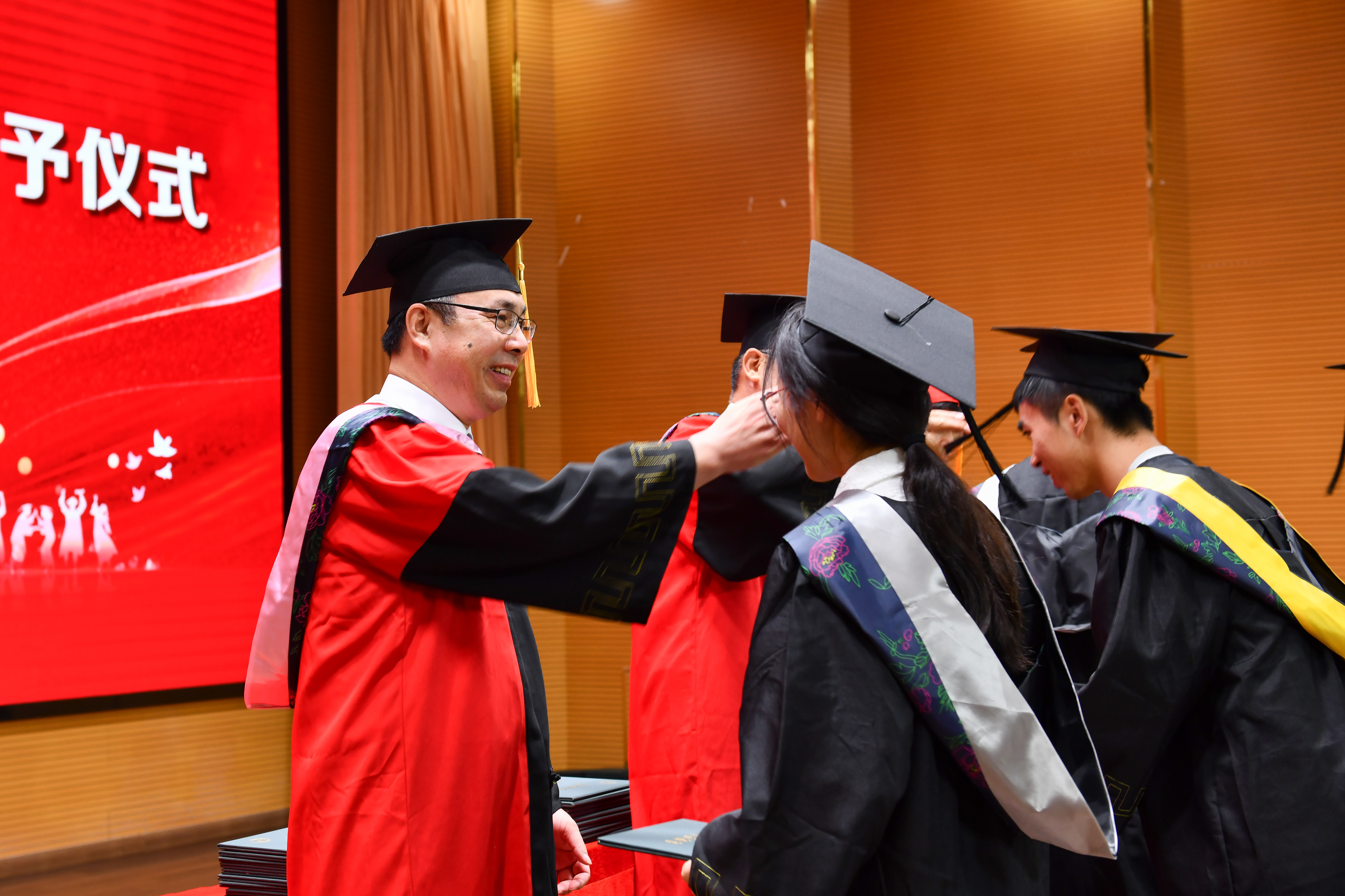 伴随着庄严的《加冕进行曲》,校领导、各学院院长依次为毕业生代表颁发学位证书、扶正流苏。