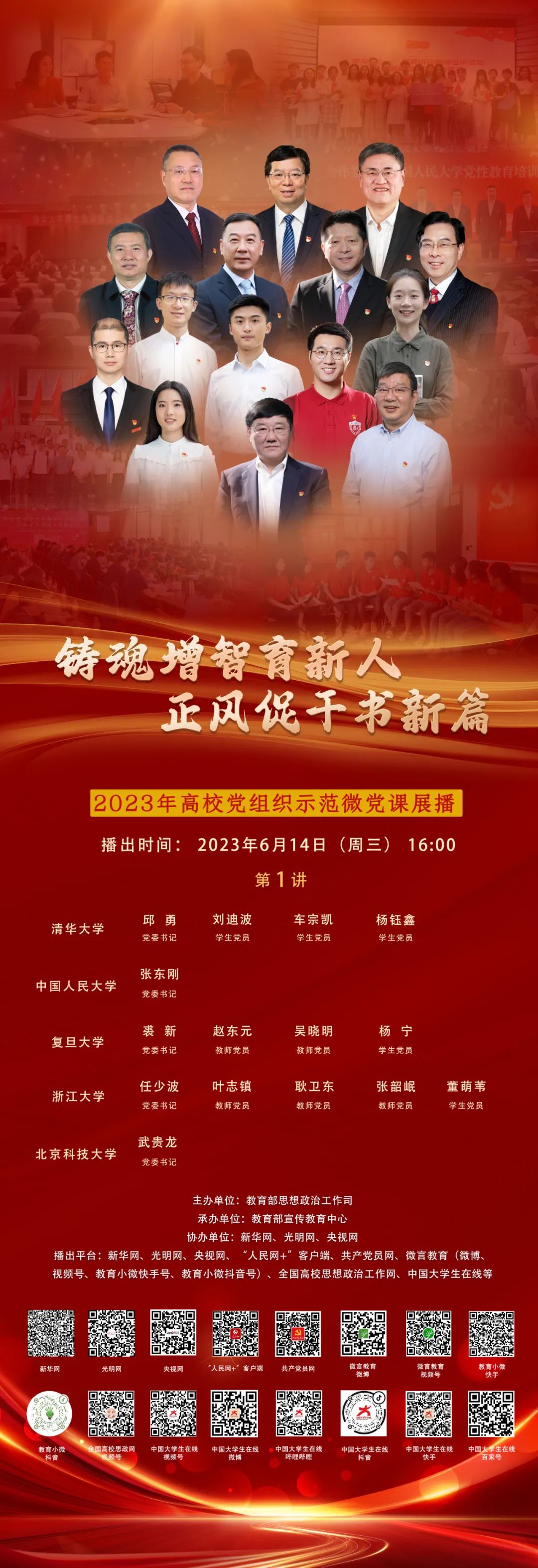 “铸魂增智育新人,正风促干书新篇”高校党组织示范微党课在新华网、光明网、央视网、“人民网+”客户端、共产党员网、微言教育(微博、视频号、教育小微快手号、教育小微抖音号)、全国高校思政网、中国大学生在线等平台进行直播,各级党组织要用线上资源,将示范微党课作为党员教育培训的重要内容,纳入“三会一课”等党的组织生活,组织广大党员干部开展形式多样的学习观看活动,学习观看后要积极组织广大党员进行交流研讨,安排专人对讨论交流情况作好记录。