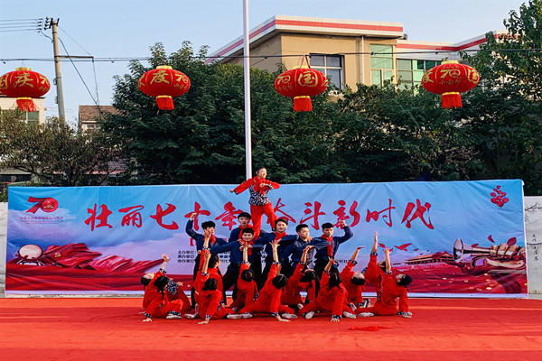 随着一首唢呐独奏完毕,太阳也逐渐西沉,栏杆集镇国庆汇演节目也迎来了最后一个压轴节目,艺术学院同学们献礼祖国七十华诞。七十载,披肝沥胆,不忘初心;七十载,风雨同舟,砥砺前行;七十载,同心筑梦,创造辉煌。将舞蹈《我爱你中国》作为贺礼恭祝祖国母亲,生日快乐!节目最后,全体起立,共同唱响《歌唱祖国》,歌声久久回荡。