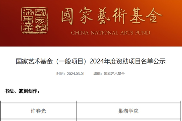 国家艺术基金旨在繁荣艺术创作、打造和推广原创精品力作、培养艺术创作人才、推进国家艺术事业的健康发展。经国家艺术基金官网公布,2024年申报受理期内,共有6208个项目主体确认提交9135个项目,申请资助资金总额约52.6亿元。其中,青年艺术创作人才项目共申报2375项,最终获批立项176项,书法与篆刻创作项目全国立项8项,安徽省仅此1项。加上之前已立项的3项美术创作类(油画)项目,目前我院共获批4项国家艺术基金项目,位居同类院校首位。