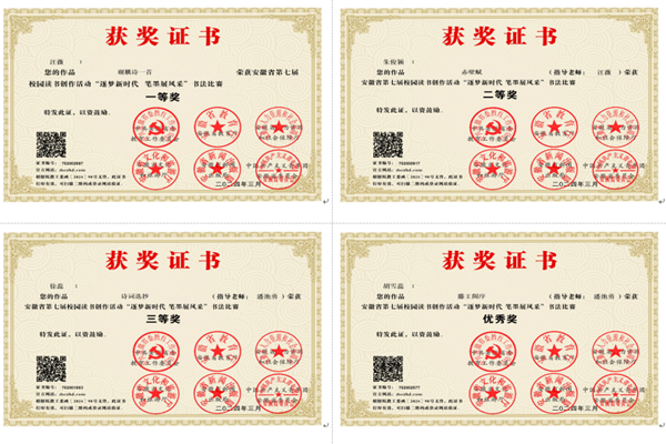 汪薇老师创作的《谢脁诗一首》作品获得安徽省一等奖;学生作品《赤壁赋》(作者:朱俊颖;指导教师:汪薇)获得安徽省二等奖;学生作品《诗词选抄》(作者:徐蕊;指导教师:潘池勇)获得安徽省三等奖;学生作品《滕王阁序》(作者:胡雪蕊;指导教师:潘池勇)获得安徽省优秀奖。
