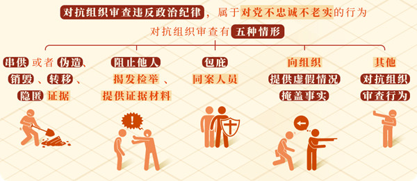 《中国共产党纪律处分条例》第六十三条规定了对抗组织审查,应予处分的五种情形:串供或者伪造、销毁、转移、隐匿证据;阻止他人揭发检举、提供证据材料;包庇同案人员;向组织提供虚假情况,掩盖事实;其他对抗组织审查行为。