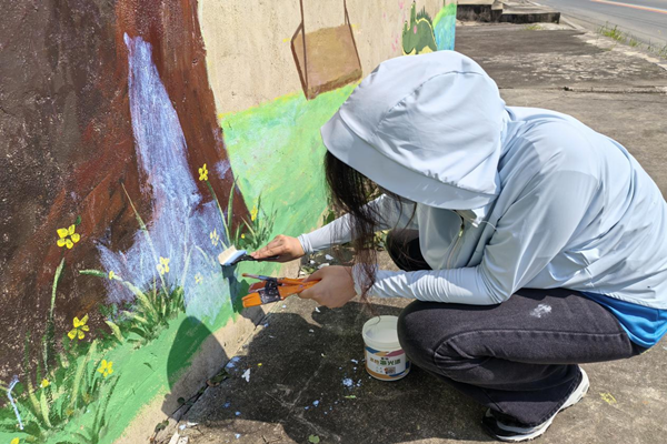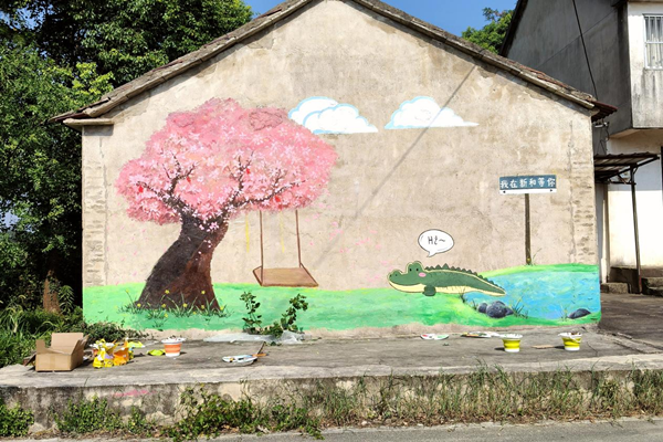 团队以墙绘为载体,融合乡村生态与文化元素,重点围绕樱花景观与扬子鳄自然保护区主题进行创作,为乡村环境增添文化亮色。