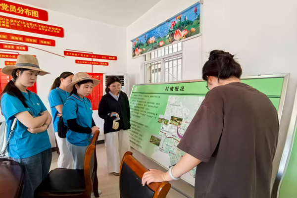 7月3日上午,团队在郭文静老师带领下抵达新和村。通过与政府负责人叶明月,村委会负责人汪红梅交流,团队了解到当地樱花景观特色鲜明,且毗邻扬子鳄自然保护区,生态文化资源丰富。随后,团队深入村落走访,挖掘樱花文化与扬子鳄保护故事,为墙绘创作积累专属素材,夯实生态文化表达基础。