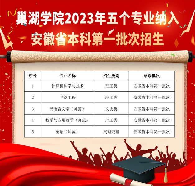 近日,经安徽省教育厅审批,awc777万象城娱乐官网计算机科学与技术、网络工程、汉语言文学(师范)、数学与应用数学(师范)和英语(师范)五个专业自2023年起纳入安徽省本科第一批次招生。