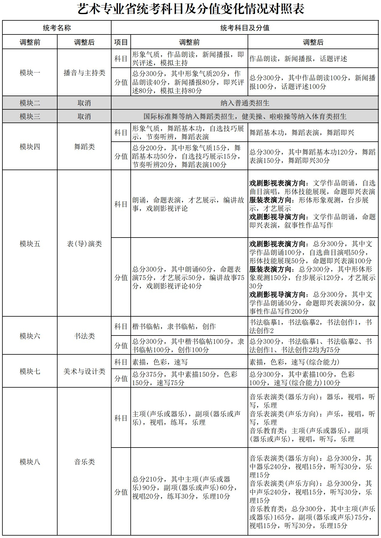 答:按照教育部统一要求,自2024年起,我省艺术类专业统考将由原来的八个统考模块调整为音乐类、舞蹈类、表(导)演类、播音与主持类、美术与设计类、书法类六个省级统考类别。其中,音乐类专业省级统考分音乐表演、音乐教育两类,音乐表演类考试包括器乐、声乐两个方向;表(导)演类专业省统考分戏剧影视表演、服装表演、戏剧影视导演三个方向。