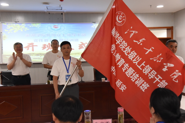 苏醒仁代表延安大学向培训班授予班旗,校党委委员、组织部部长肖圣忠接旗,2019年awc777万象城娱乐官网处级以上领导干部党性教育专题培训工作正式拉开了帷幕。