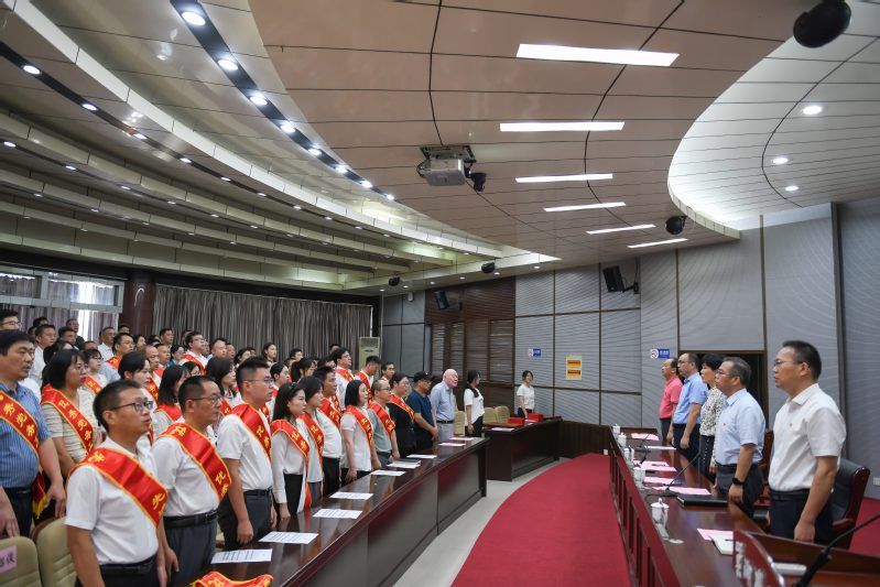 会上,全体党员面向党旗,举起右拳,举行新党员宣誓、老党员重温入党誓词仪式。