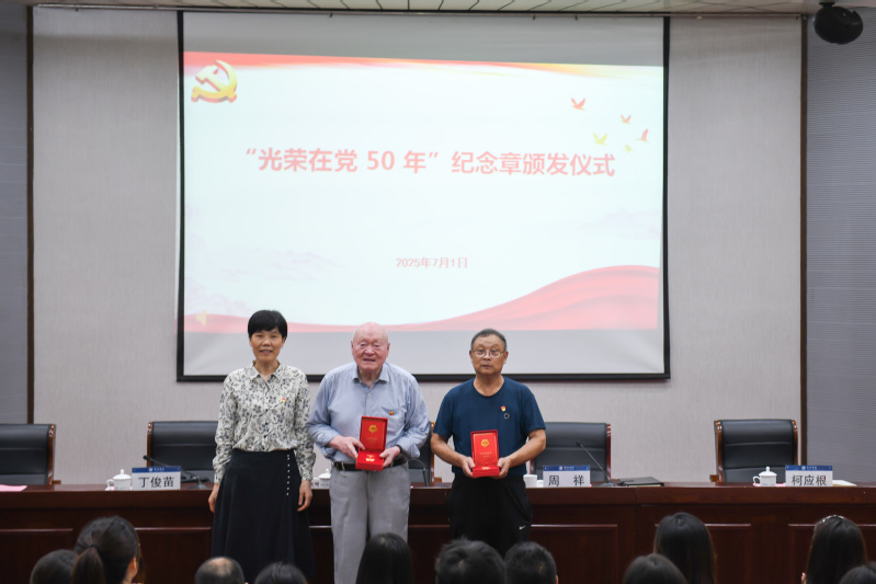 校党委副书记、校长张莉为“光荣在党50年”纪念章获得者吴祖民、夏忠义两位老党员颁发纪念章。