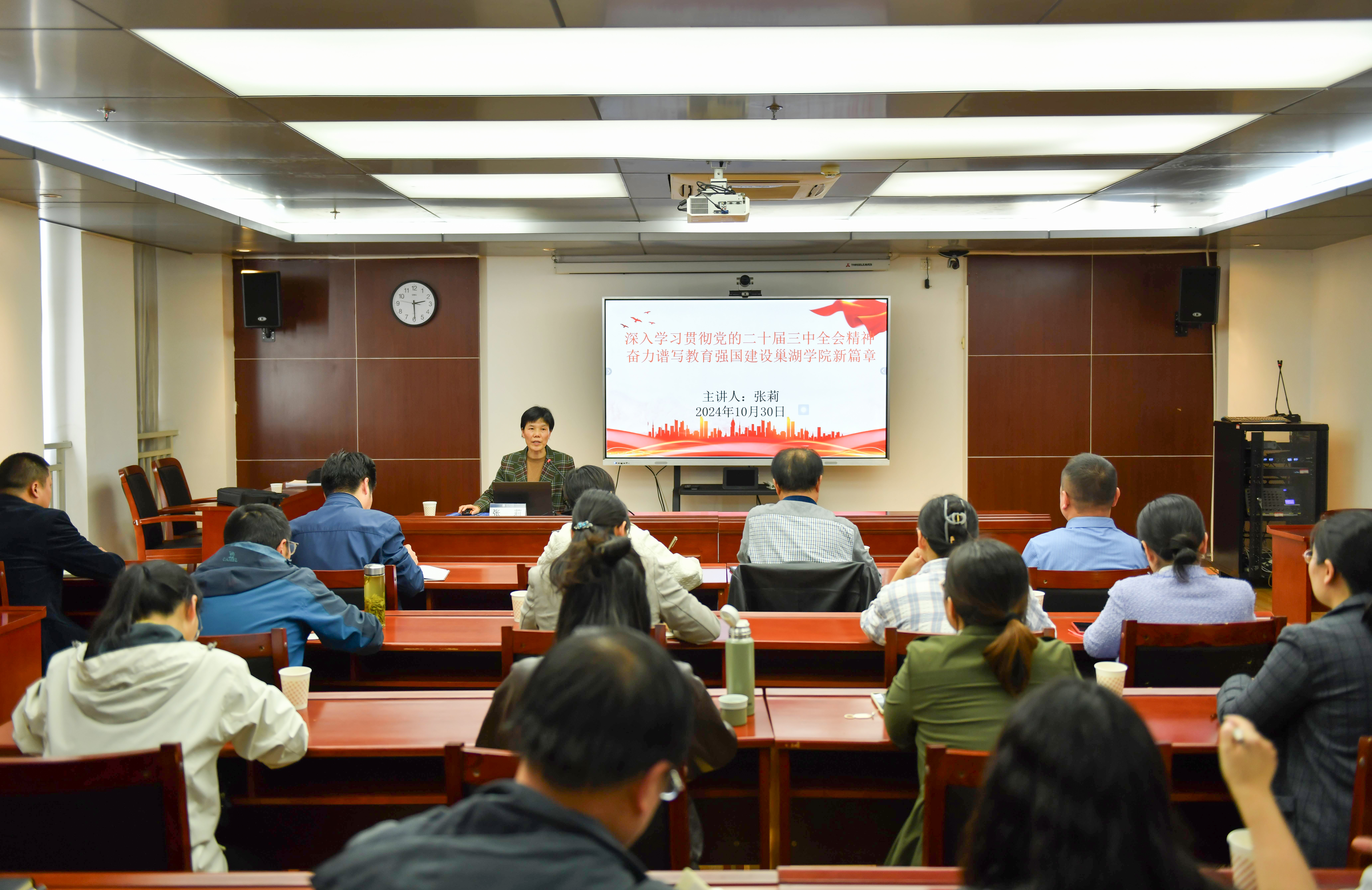 10月30日下午,awc777万象城娱乐官网在第三会议室组织开展党的二十届三中全会精神宣讲活动,党委副书记、校长张莉作题为《深入学习贯彻党的二十届三中全会精神 奋力谱写教育强国建设awc777万象城娱乐官网新篇章》的宣讲报告。学校审计处、图书馆、体育学院、工商管理学院、数学与大数据学院、化学与材料工程学院等单位党政主要负责人及有关同志参加宣讲会。
