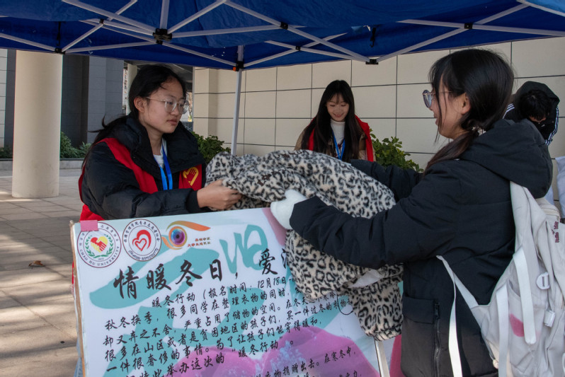 爱心接力,温暖传递。学生们积极响应活动号召,加入旧衣捐赠的行列。他们仔细地将清洗干净的旧衣服叠放整齐装入收纳袋,并附上标有自己信息的卡片一起交给志愿者。志愿者们面带微笑,热情迎接每一位前来捐赠衣物的同学,耐心讲解捐赠流程与注意事项,有条不紊地对这些衣物进行登记、分类整理和打包。这些色彩斑斓的衣物被有序地摆放,为这个寒冷的冬季带来了一抹抹温暖的色彩。经法学院青年志愿者协会联合环保回收公益平台,将同学们捐赠的爱心衣物送到了山区需要帮助的人手中,一袋袋衣物,承载着学子们的爱心与担当,它们将化作冬日暖阳,温暖远方。